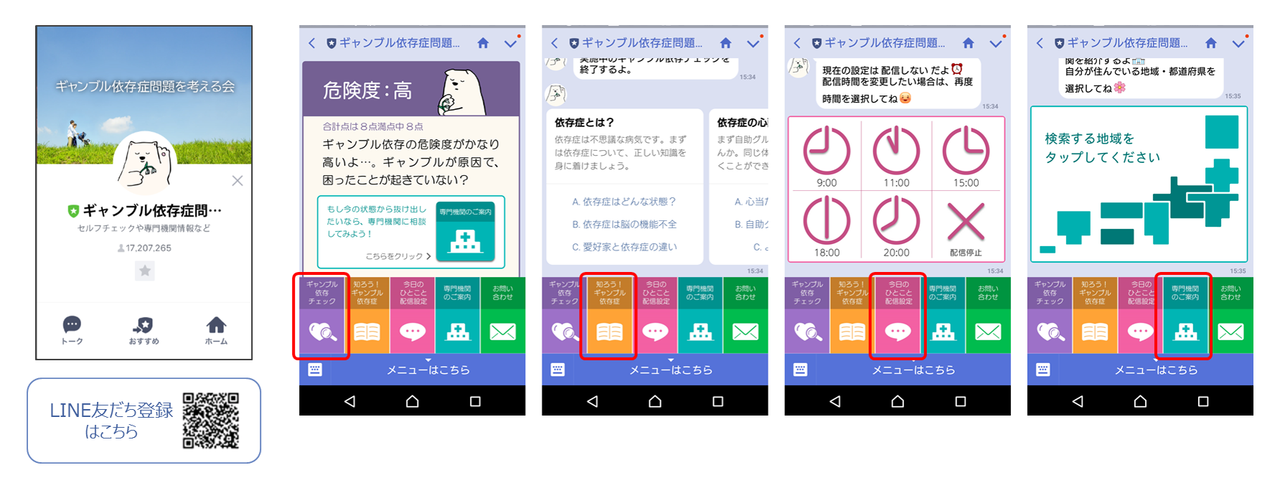 木村さん:研究成果は LINEを活用したセルフチェックツール として提供されています。さらにこのツールでは、依存症に関する豆知識や毎日のひとことメッセージの配信なども行っています。メッセージ配信時刻を朝型の人は朝9時、夜遅くまで働いている人は20時というように自分で設定でき、さまざまなライフスタイルの人に使ってもらえるよう、そして、ギャンブル依存症問題の啓発につながるよう工夫しました。少しでもギャンブル依存でお困りの方のお役に立てるよう今後もブラッシュアップしていきたいですね。