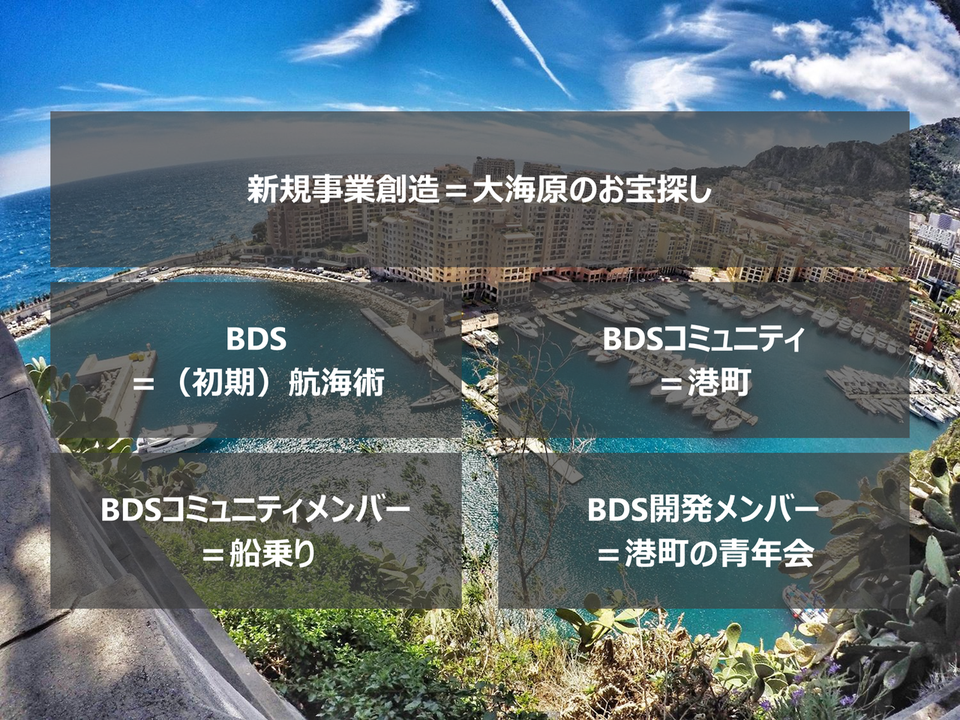 田邉さん:そうですね。新規事業創造って言わば大海原での宝探しのようなものなので、その中でBDSコミュニティが活気ある港町のような立ち位置になれば良いなと考えています。BDSが航海術、コミュニティに集う社員が船乗りだとイメージすると、港町であるBDSコミュニティが船乗りたちのホームとして安心感があり、かつ常に活気づいていれば、多くの人がコミュニティでさまざまな学びや出会いを得て、新たな船出(新規事業への挑戦)がしやすくなると思っています。
