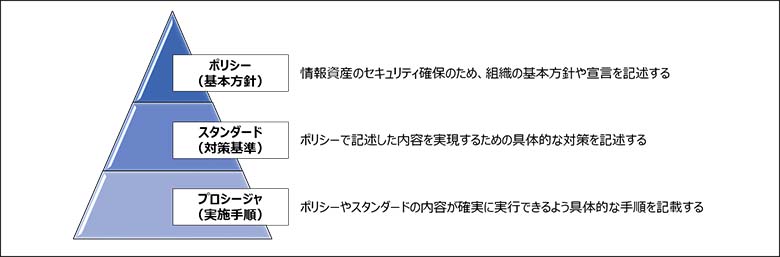 組織で策定される一般的なセキュリティルールは、「ポリシー(基本方針)」、「スタンダート(対策基準)」、「プロシージャ(実施手順)」の3つの文書で構成されます。各文書に示すべき内容は、以下の通りです。