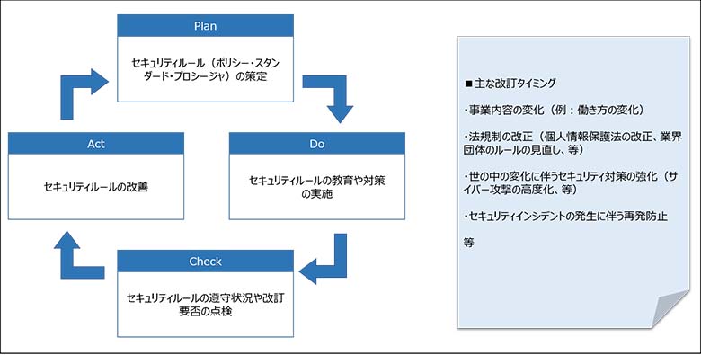 ルールは一回策定して終わりではなく、PDCAサイクルを回して定期的な見直しを行うことが必要です。