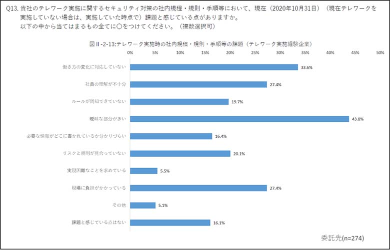 図3:セキュリティ対策の社内規程・規則・手順等の課題(IPA「ニューノーマルにおけるテレワークとITサプライチェーンのセキュリティ実態調査 調査報告書」の付録資料 アンケート調査単純集計結果II.組織調査より引用)