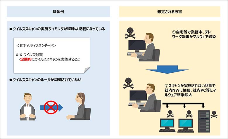 公開されているガイドライン等を参考に具体的なルールの記載を行うことや、ルールの改定時には勉強会を開催する等により組織全体に共有することが必要です。具体的な手順を記載したプロシージャを作成することにより、社員の理解度向上を図ることも有効です。テレワークのルール整備では、総務省が2021年5月に公表した「テレワークセキュリティガイドライン(第5版)」、「中小企業等担当者向けテレワークセキュリティの手引き(チェックリスト)(第2版)」(※3)が参考になります。組織が実施すべき対策だけでなく具体的なセキュリティインシデントの事例も紹介されており、勉強会でも活用できるでしょう。