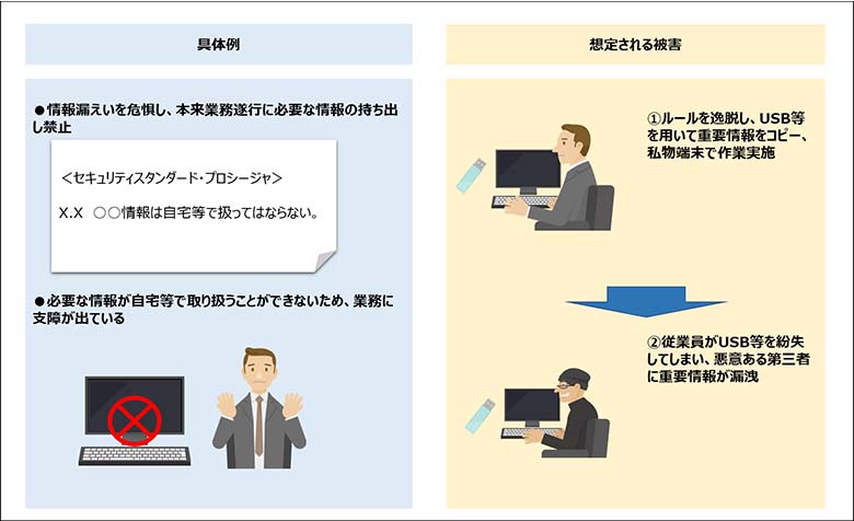 ルールを整備する際には、業務に支障が生じないかどうかルールを整備する組織と業務を行う現場で意識合わせすることが重要です。守るべき情報の価値や想定される脅威、発生頻度などを踏まえ、実施する対策レベルを決定する必要があります。