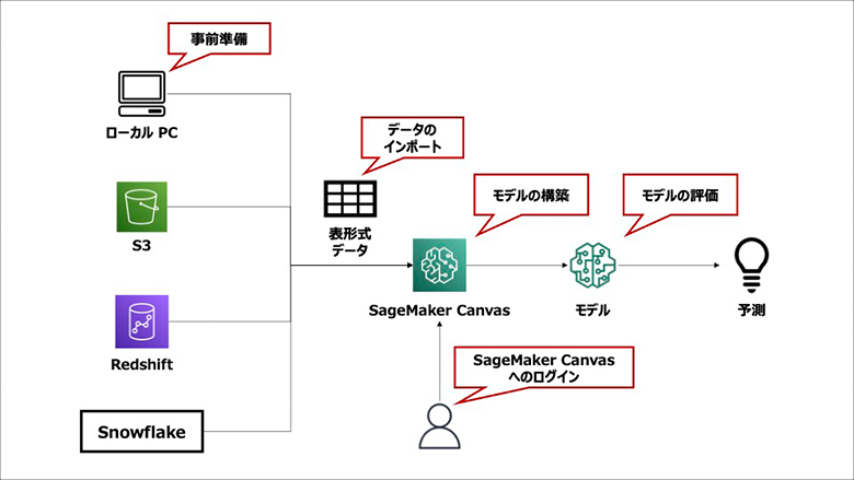 下図はSageMaker Canvasの利用イメージです。手元に表形式の構造化されたデータがあれば、SageMaker Canvasを使ってAIによる予測が簡単に行えます。