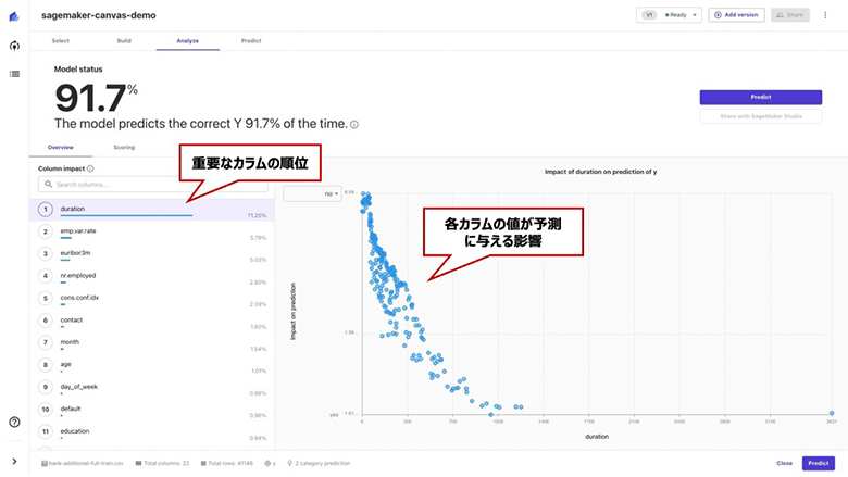 AIによる予測は中身がブラックボックス化されて、判断根拠の曖昧さが問題になりがちです。SageMaker Canvasは「説明可能なAI(Explainable AI:XAI)」と呼ばれるモデルの判断根拠を可視化する機能が備わっています。予測に影響を与える重要なカラムの順位や各カラムの値が予測に与える影響を可視化できるので、業務知識をもとにした妥当性の確認やステークホルダーへの説明も可能です。