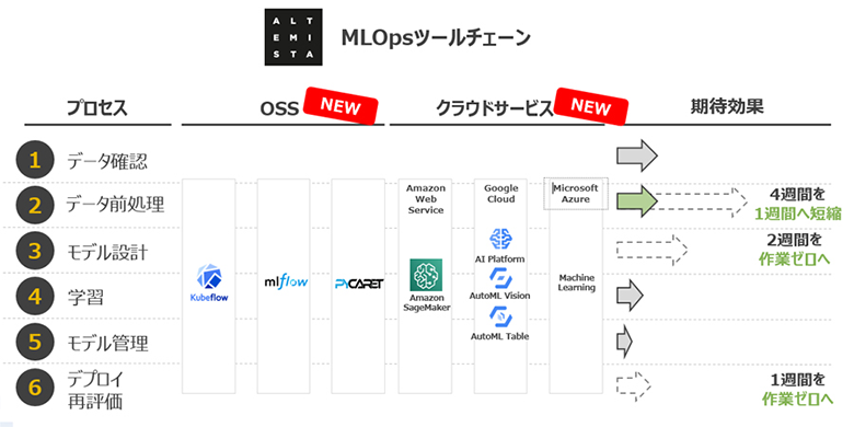 NTTデータでは、顧客体験の向上を実現するためのサービスデザイン手法やアジャイル開発の方法論をまとめたソリューション群である「Altemista」を提供しています。Altemistaでは、OSSやAWSをはじめとするクラウドサービスで提供される機械学習ツール群を組み込んだMLOpsの導入サービスを提供しています。