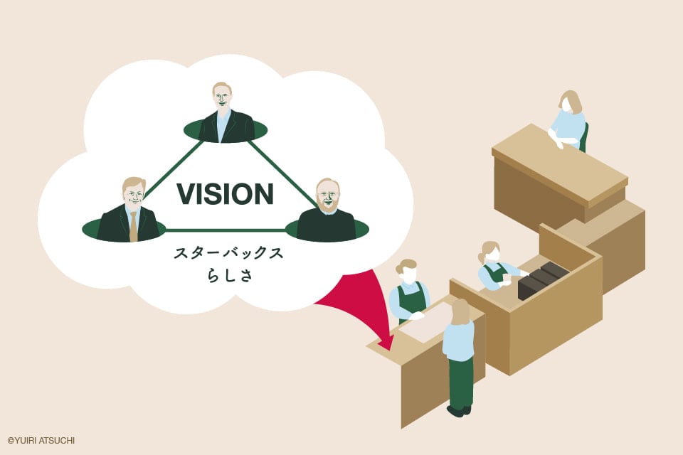 梅本さんは、3人の関係を「ビジョンを真ん中に置いた三角形」と表現しました。ビジョンを真ん中にそれぞれの考えをぶつけ合い、ビジョンを磨き上げていった。その結果、スターバックスは本場イタリア風のコーヒーが飲めるというだけでなく、居心地の良い店舗で気さくな店員から暖かいサービスを受けられるという、独自のブランドイメージを築いていったのです。