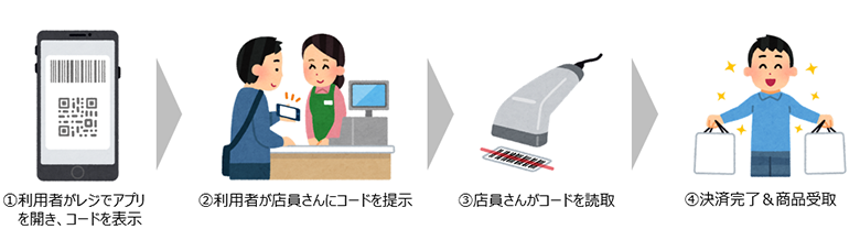 図2のようにスマートフォン上の決済アプリを利用してQRコード(※4)やバーコードを読み取ることにより店舗で決済を行う仕組みです。利用者がコードを提示するCPM(Consumer Presented Mode)とお店がコードを提示するMPM(Merchant Presented Mode)の2つの方式があります。