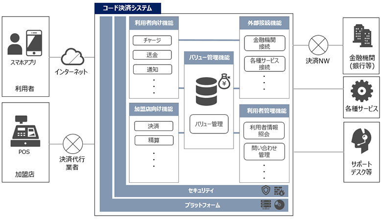 | 4 | 外部接続 | 利用者の資産をコード決済事業者側に移動するため、銀行やクレジットカード会社などの金融機関と連携します(キャリア決済やコンビニATMと接続する事業者もいます)。 また、必要に応じて認証、ID連携などを行うための外部サービスと接続します。 |