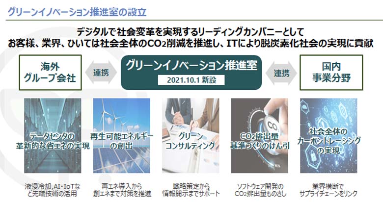 こうした状況を受け、NTTデータは2021年10月1日、海外のグループ企業も含め、グローバル全体でグリーンの取り組みを推進する組織『グリーンイノベーション推進室』を設立した。「NTTデータ自身だけでなく、業界やお客様、そして社会全体のCO2削減の貢献を目指します」(下垣)