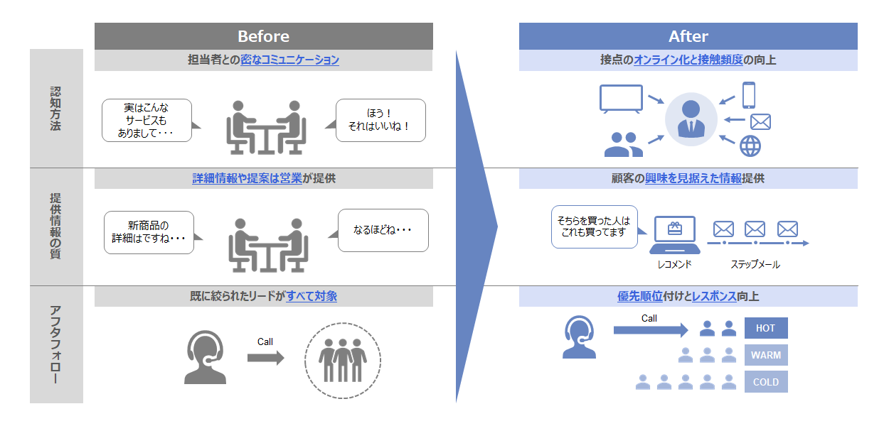 荒川:昨今のコロナ禍を契機に,お客様の購買行動のデジタルシフトが一層加速しています。非対面のオンラインコミュニケーションが増加したことで、お客様の行動履歴を把握しやすくなりました。この状況下でタッチポイントと対応を最適化するにあたり、「オンライン上での認知の推進」、「お客様が興味をもつ情報のオンライン提供」、「迅速なアフターフォロー」がますます重要になっています。