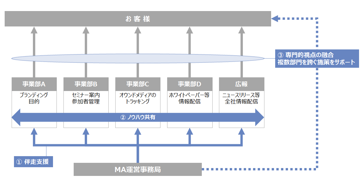 第二に、活用ノウハウの蓄積とその横展開です。MA運用では、各組織のマーケティングプロセスや目的に合わせて機能を使いこなすことが重要ですが、容易ではありません。業務シーンごとに、MAで“できること”と“解決したいこと”を紐づける作業が必要になるためです。しかも、“解決したいこと”は利用部門毎に異なるため、シーンに応じて事前にマニュアルを用意することは困難です。そのため、活用ノウハウの実績と横展開の場が必要でした。
