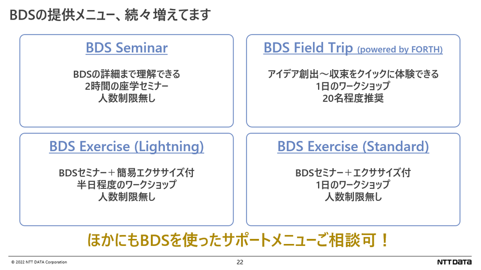 また、BDSを活用した新規ビジネス創出支援は、各種サポートメニューも充実。社内外からたくさんの問い合わせをいただき、今年度が始まって4か月ほどで社内外10組織のサポートをしているとか。中でもアイデア創出の1dayワークショップ「BDS Field trip」が大人気とのこと。直近4か月だけで4組織、計7回のワークショップを開催したそうです。