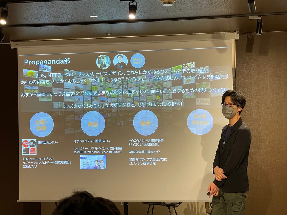 ふたつめは、プロパガンダ部です。なんだか怪しげ(?)な名前ですが、どんな部活なのでしょうか?部長の西村さんいわく、NTTデータの新規事業と言われても、イメージがない人がほとんどなのでは?との課題感があったとのこと。まずはNTTデータの新規事業を知ってもらうことから、いろいろたくらみ、仕掛けていこう!という想いで、部活を立ち上げられたそうです。
