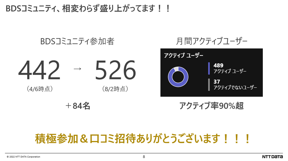 2020年後半に社員有志で設立されたオンラインのBDSコミュニティ、2022年8月2日時点で参加者は500名超、そしてこれだけの巨大コミュニティにも関わらず、アクティブ率は90%超えとのこと!執筆者も驚きの数字でした。新規ビジネス案の壁打ち相談、アンケート協力依頼、コネクション探しなど、新規ビジネスに挑戦する社員からの問い合わせと相互相談が常に行われているとのことで、NTTデータ社内の新規ビジネスへの関心の高まりがうかがえます。