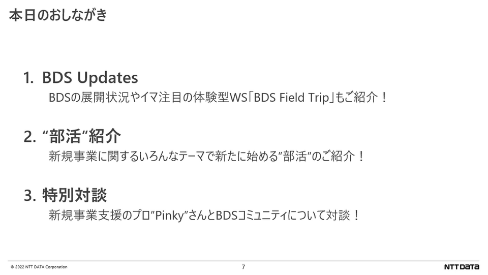 イベント名にもある「BDS(ビジネスデザインスプリント)」は、「普通の会社員でもできる、新規ビジネス企画の第一歩」をコンセプトに、分かりやすさを追求して開発された「新規ビジネス企画ドリル(問題集)」です。そして、このBDSを共通項に、NTTデータ社内で部門や役職を超えて新規事業創造に奮闘する社員たちが集うオンラインコミュニティが、「BDSコミュニティ」です。