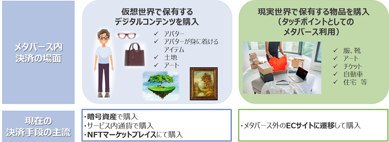 現在のメタバースにおける決済の場面は、「仮想世界において保有するデジタルコンテンツの購入」と「現実世界で保有する物品の購入」に分けられます(図1)。「仮想世界において保有するデジタルコンテンツの購入」に際しては、現在は独自通貨(メタバースサービス内通貨)や暗号資産等による決済、もしくはサービス外のNFTマーケットプレイス等でデジタルコンテンツを購入し、サービス内に持ち込むという形が主流です。また、「現実世界において保有する物品の購入」については、たとえばアパレルの仮想店舗において試着を行い、購入する場合などが挙げられます。この場合、現在は購入の段階でサービス外のECサイトに遷移する形が主流です。