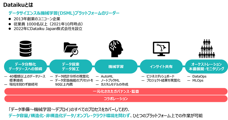 データプリパレーションツールの例としてはDatabricksやDataiku等があります。そのうちの一つであるDataikuはデータサイエンス&機械学習プラットフォームのリーダー製品で、データ活用の全プロセスが一つのプラットフォームで完結しているといった特徴があります。