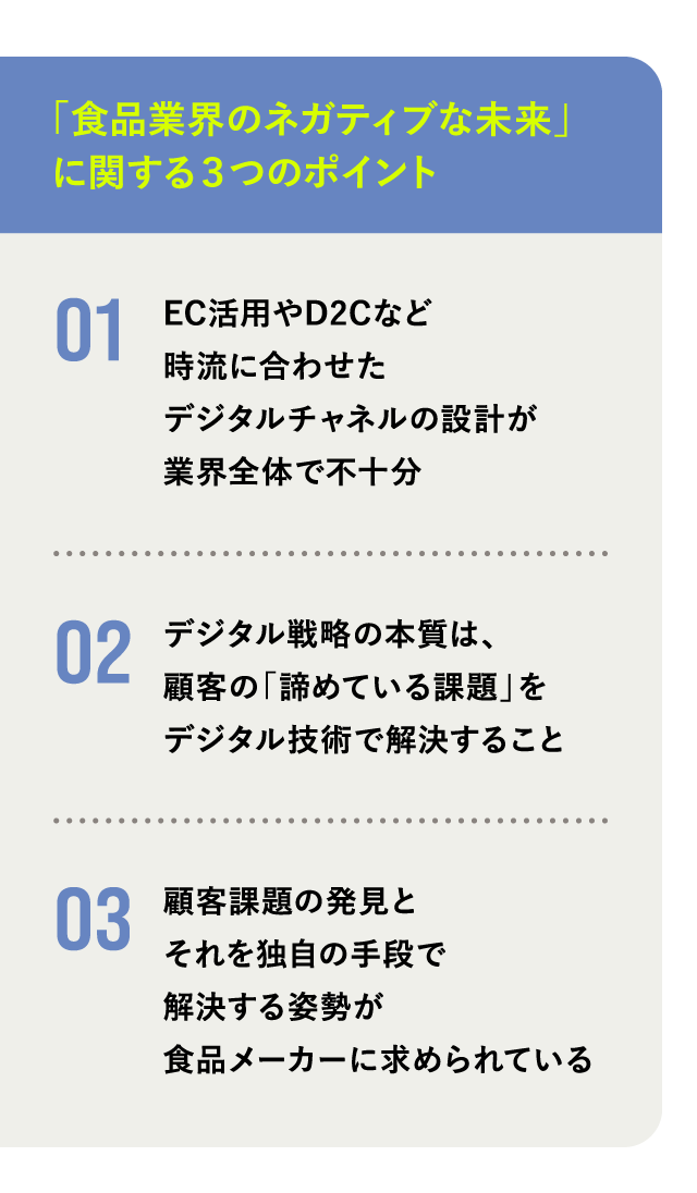 食品メーカーが顧客の課題を本気で探さない限り、EC活用もデジタル化も進まないでしょうね。