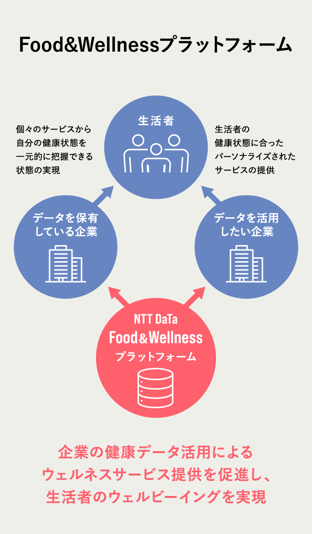 NTTデータとしてもそこに貢献したく、様々な企業や団体に眠る健康データを集め、食品メーカーの商品開発に活用してもらうためのプラットフォームを作りました。