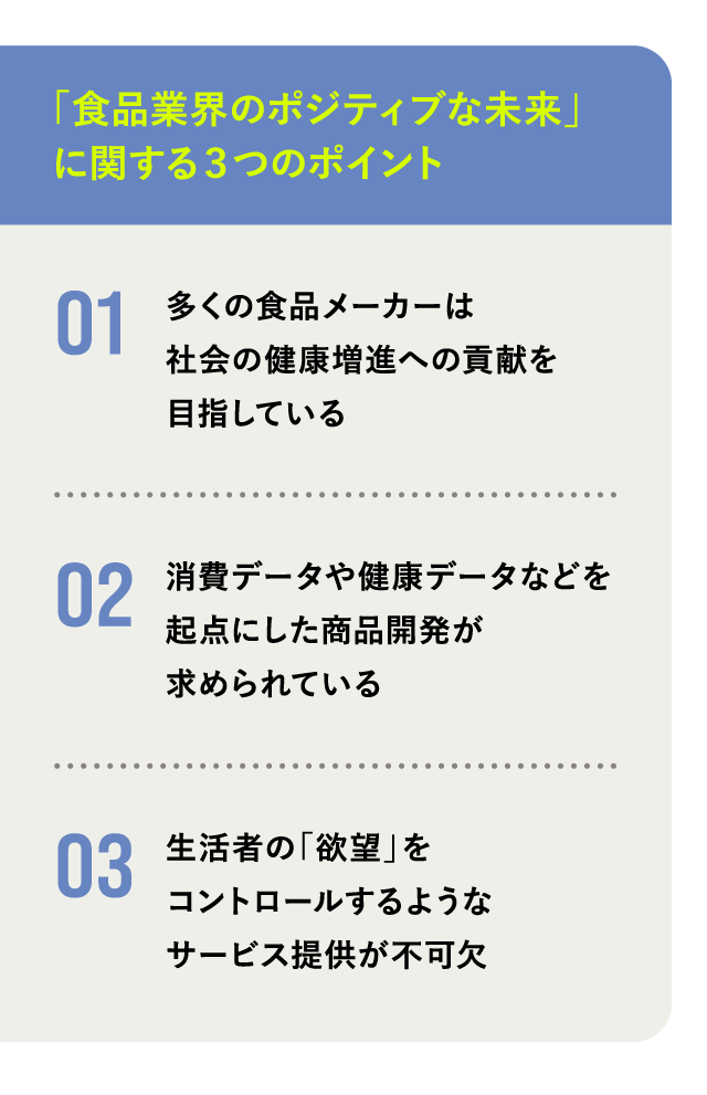 その動きが結実して、人々の健康に食品業界がこれまで以上に貢献するようになっていくことがポジティブな未来と言えるでしょう。