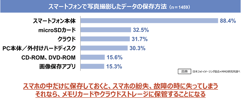 たとえばスマホにある写真データ。皆さんはどこに保存していますか?ある調査によればデータをスマホ本体にそのまま保存している方の割合が88.4%。クラウドに保存している方、micro SDカードに保存している方がそれぞれ30%程度。スマホ本体に保存している場合、万が一スマホを紛失した場合や故障、機種変更などした場合にデータをどう移行するのか、課題となります。そのような煩わしさを避けるためにも、micro SDカードやクラウドストレージに保存するという方法は今のところ有効なのかもしれません。しかし、クラウドストレージに保存しておけば万全なのでしょうか。実はそういうわけでもないのです。