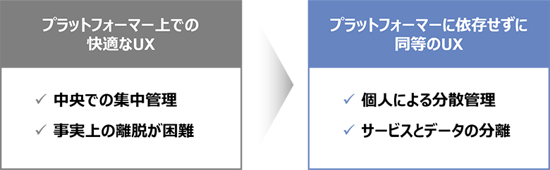 どちらの記事も、自分自身でデータを管理する時代に突入したことを示しているといえます。これまでのプラットフォーマー上でのデータ管理は中央での集中管理。一方新たな動きとして、サービスとデータを分離させた個人による分散管理。この2つの手法が今、並立しているのです。この分散管理型を選択すれば、いざという時に自身が所有するデータを苦労して移行する必要はなくなります。