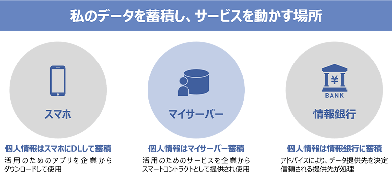 では、自分でデータを管理し、データの置き場所を選ぶためには、どんな新技術が必要になるでしょうか。ここでは3つの種類に分けてみていきます。