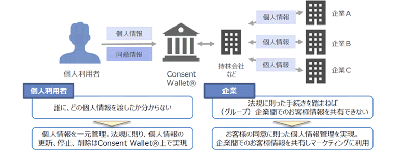 NTTデータではこの分野に関し、ConsentWallet®というサービスを提供しています。本サービスを使えば個人利用者はいつでもどこでも自身の同意を管理できる。一方企業は、本サービスを見れば使えるデータを一覧できます。