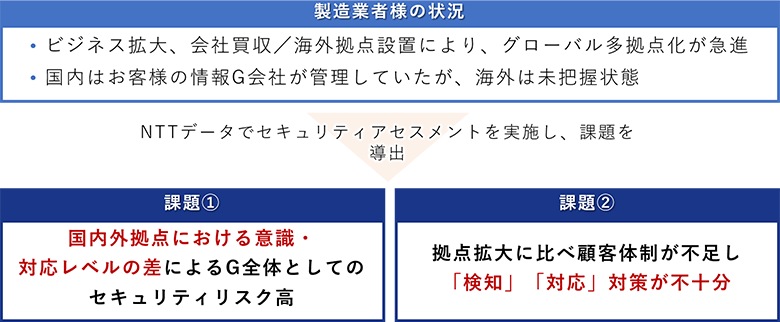 とある製造業者さまでは、ビジネス拡大や会社買収、海外拠点設置により、グローバル多拠点化が急進されておりました。国内拠点については、お客さまの情報グループ会社さまが管理されていましたが、拡大された海外拠点についてはセキュリティ施策や状況を十分に把握していませんでした。