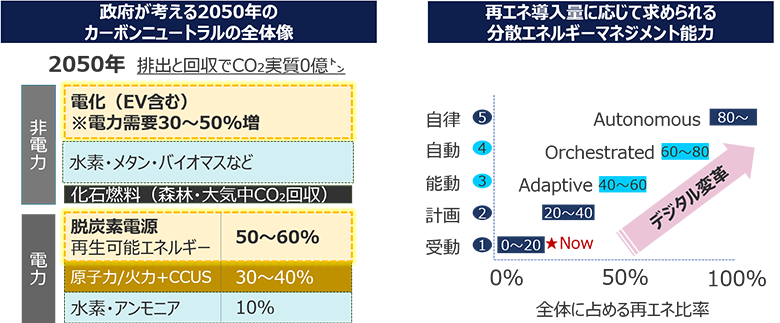 上図は、政府が2050年に目指すカーボンニュートラルの全体像です。非電力部門では、EVに代表される電化を進め、電力部門では原子力や水素に加え、再生可能エネルギー比率を50~60%まで引き上げるチャレンジングな目標が掲げられています。その目標達成に欠かせないのが、分散配置される再生エネルギー(DER:ディストリビューテッド・エナジー・リソース)の大量導入です。