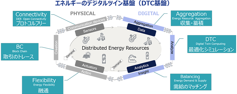 そこでNTTデータが目指しているのが、「再生可能エネルギーのデジタルツイン(DTC)基盤」の構築です。大量に分散されるDERのデータをダイナミックに流通させ、デジタルの力で再生可能エネルギーを主力電源化することを目指しています。