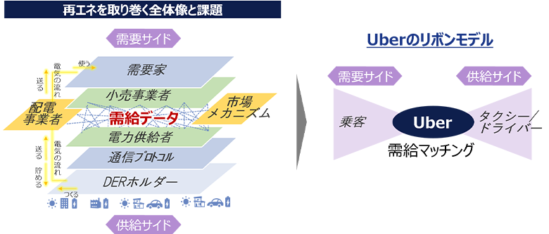 もちろん、再生可能エネルギー経済圏の「リボンモデル」としても可能性を秘めています。Uberのモデルでは、タクシードライバーの位置データと利用者の位置データと掛け合わせてマッチングさせています。これを再生可能エネルギー経済圏に当てはめると、需要動向がわかるスマートメーターのデータと供給動向がわかるDERデータを掛け合わせることで、需給マッチングを行うマーケットプレイスである「場」としての価値も高めるということになります。