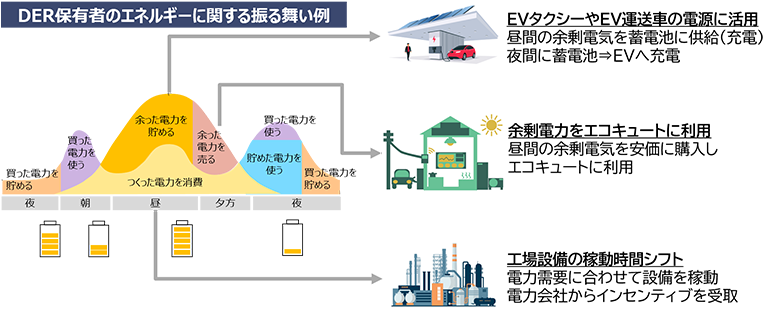 この効率的な動きを活用すれば、例えば、昼間の余剰電気を蓄電池に充電し夜間にEVへ充電したり、安価に購入しエコキュートに利用したりできるでしょう。また、工場では、電力需要に合わせて設備を稼動し、電力会社からインセンティブを受取ることも考えられます。