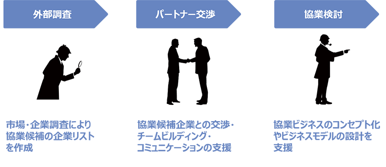 今回のビジネスの創発に至った経緯には次のようなステップが存在すると、渡辺とともにオープンイノベーションを推進するNTTデータ事業戦略室 課長の藤原 健一は説明する。