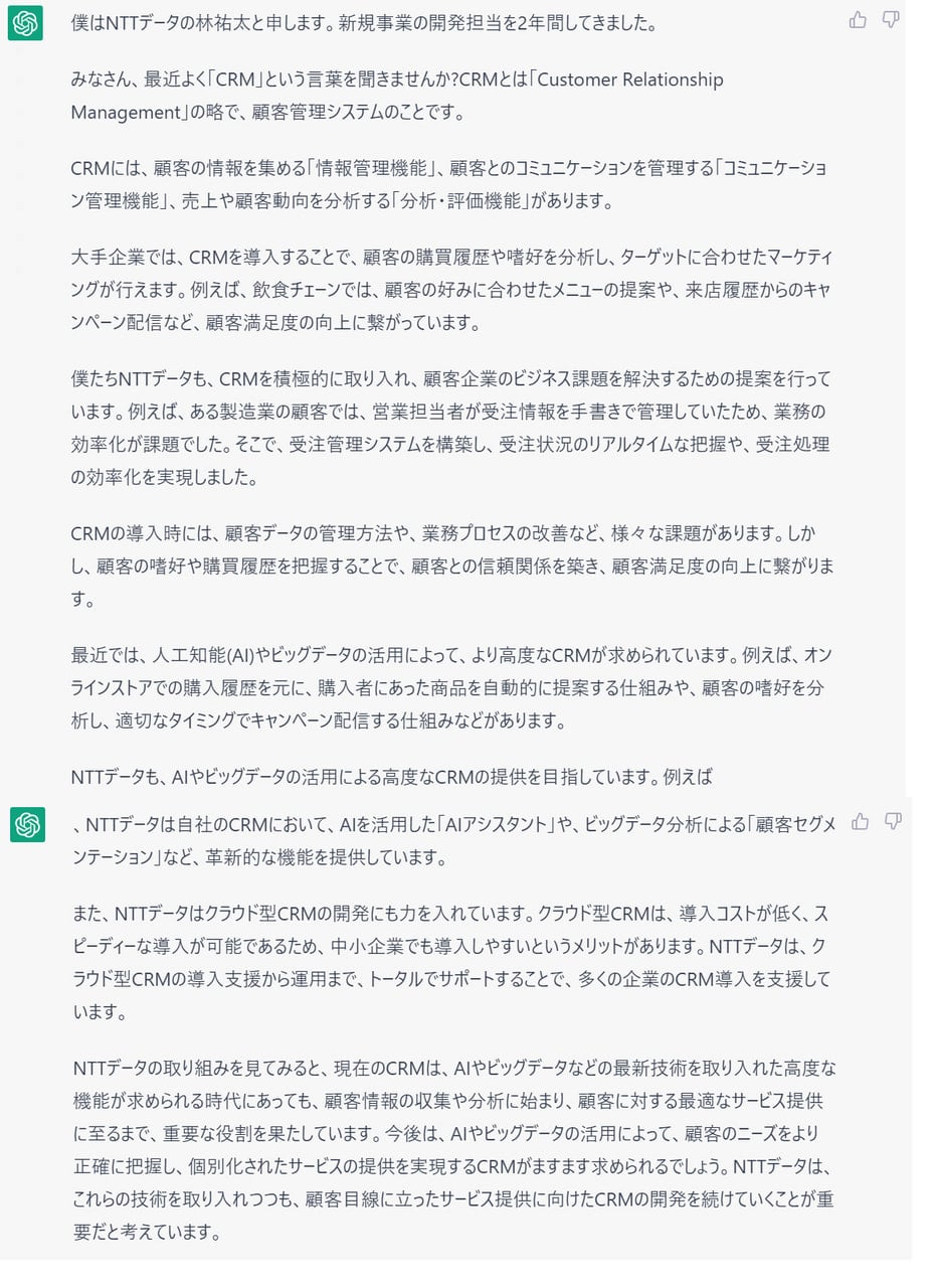 凄い完成度ですね!若干口調が変わったとともに、NTTデータについて多く触れるようになっており、僕が書いたと言ってもバレないような気がします。(少しNTTデータと言いすぎな気もしますが……。)