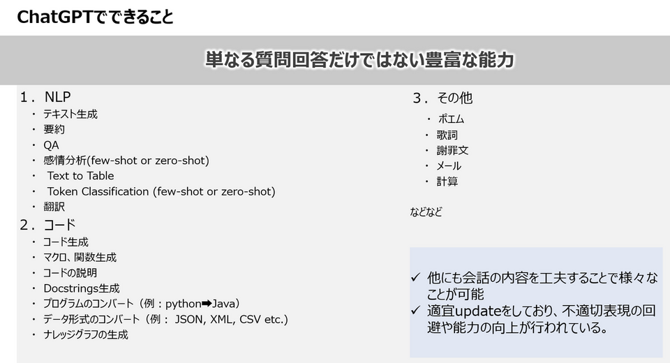 ChatGPT(Chat Generative Pre-trained Transformer)は、OpenAIが2022年11月に公開したチャットボットです。簡単に言うと、質問に対して文章で回答してくれるAIです。それだけだとたいしたことない、と思うかもしれませんが、決してそんなことはありません。できる範囲は単なる質問回答にとどまらず、要約やコードの生成などさまざまなことができます。