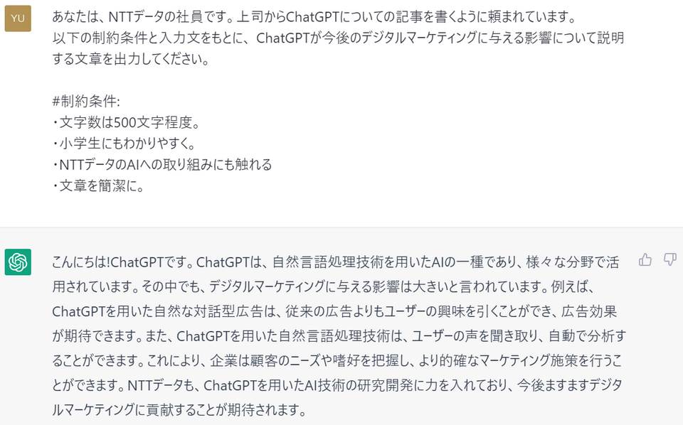 最後に、AIの役割をもっと明確化してみます。僕自身である、NTTデータ社員の林祐太として、記事を書いてもらいましょう。ここまで徹底できれば、まさに自分が書くような文章を書いてもらうことも可能なはずです。