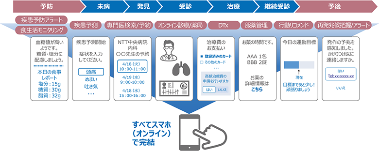 これまで医療と患者には「病気になって病院へ行く」「薬局で薬を処方してもらう」というような限られた接点しかありませんでした。今後は病気未満の状態である「予防」、そして通院後の「予後」まで、医療の提供範囲は広がっていくでしょう。