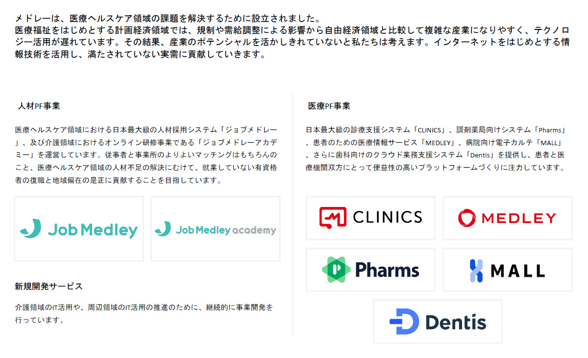 「メドレーは“医療ヘルスケアの未来をつくる会社”として2009年に創業しました。事業は大きく2つあり、人材プラットフォーム事業と医療プラットフォーム事業です。後者では、診療所・病院向けに電子カルテやオンライン診療システムを提供、患者向けにはNTTドコモと共同でオンライン診療・服薬指導アプリ「CLINICS(クリニクス)」を運営しています」(豊田氏)