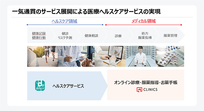 「ヘルスケア領域においては、主に『dヘルスケア』を提供しています。利用者のお悩みに応じた情報発信だけでなく、歩いてポイントが貯まるというサービスによって、健康増進につながるような行動変容を促す仕組みを取り入れています。一方でメディカル領域においては、『CLINICS』をメドレーと共同運営しており、オンラインで診療が受けられることはもちろん、オンライン服薬指導までシームレスに利用可能です。また、自治体向けヘルスケアサービス『健康マイレージサービス』では、従来のウォーキング機能に加え、健康アドバイス機能やみまもり機能を提供しています。このように、ヘルスケア領域からメディカル領域までを一気通貫で実現することが私たちの取り組みの特徴です」。