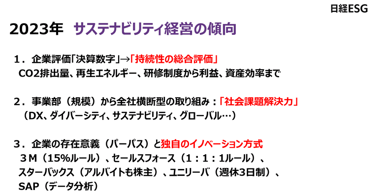 近年、企業はサステナビリティへの取り組みが強く求められるようになった。『日経ESG』発行人の酒井耕一氏は、2023年のサステナビリティ経営の傾向として3つのポイントを挙げた。