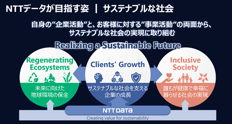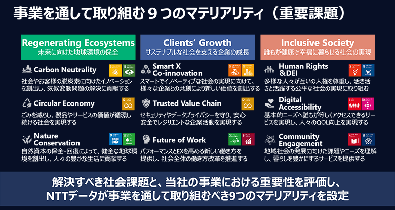2022年、NTTデータはサステナブルな社会の実現を目指し、「Realizing a Sustainable Future」というスローガンを掲げた中期経営計画を打ち出した。これを実現するために「サステナブルな社会を支える企業の成長」「未来に向けた地球環境保全」「誰もが健康で幸福に暮らせる社会の実現」の3つを軸とし、そのうえでより具体的な9つの重要課題(マテリアリティ)を設定。社会、お客様に提供する価値を明確にし、事業を通じた価値創出をはじめとする様々な活動に取り組んでいる。