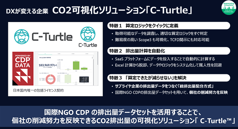 まず、企業全体のCO2排出量を可視化するソリューションの「C-Turtle」だ。サプライチェーン全体の中で自社がどのくらいCO2を排出しているかを自動的に計算して可視化。例えば、サプライチェーンの上流にある企業がCO2排出量を削減した場合、その製品を購入している自社もCO2排出量を削減できるなど、サプライチェーンの複雑な相関関係を反映できる。見えにくい部分までプラットフォーム上で管理できる点がメリットだ。
