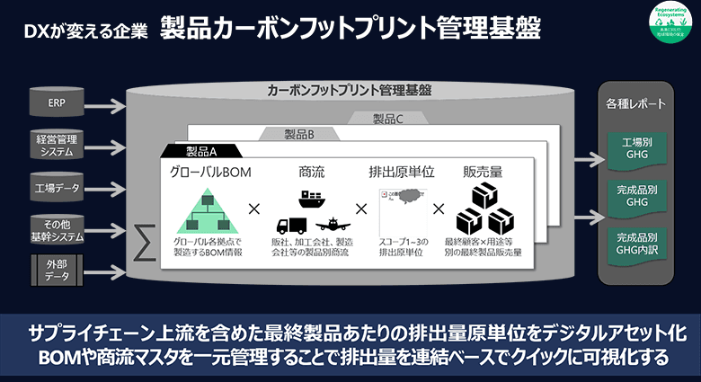 一方で、自社の製品やサービスがどのくらいのCO2を排出しているかを可視化するソリューションとして提供しているのが、「製品カーボンフットプリント管理基盤」だ。調達原料や外注加工を含んだ最終製品あたりのCO2排出量原単位をデジタルアセット化して一元管理し、連結ベースでリアルタイムに可視化することができる仕組み。旭化成と共同で開発し、2022年4月から旭化成で運用をスタート。旭化成は現在、約1万点の製品をこのプラットフォームで管理しているという。
