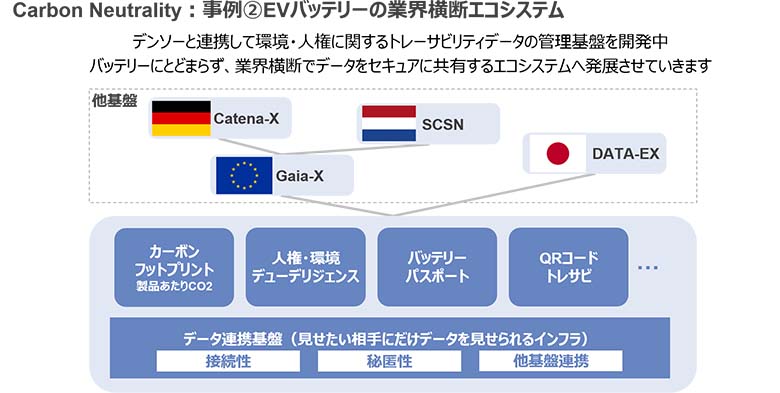 「サプライチェーンにおいて、NTTデータでは他社との連携を実現するためにトレーサビリティデータを管理する基盤を開発しています。ベースとなるデータ連携基盤においては、見せたい相手に必要なデータだけを簡単に見せられる接続性とともに、守りたいデータを守れる秘匿性も備え、かつ海外ふくむ他基盤との連携が容易であることを特徴とします。機能としては、ライフサイクル全体におけるバッテリーのCO2排出量を開示する「カーボンフットプリント」、サプライチェーンにおけるサステナビリティ配慮を問う「人権・環境デューデリジェンス」、バッテリー単位で必要な情報を簡単に確認できる「バッテリーパスポート」に遵守した管理、QRコードを使用した「トレーサビリティ」の管理を実現します。カーボンニュートラルにとどまらず、サステナビリティを複合的に後押ししていきます。」(下垣)