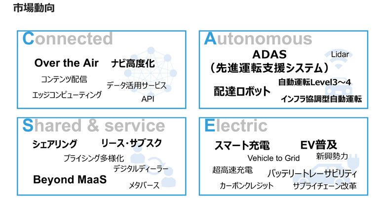 Aは、ADAS(先進運転支援システム)がわかりやすい。ADASの代表的な機能として、前走車を追随して運転をサポートするACC(オート・クルーズ・コントロール)がすでに普及している。さらに、自動運転もAにおいて注目されている領域だ。一般乗用車への普及にはまだまだ時間がかかる見通しだが、駐車場などの特定空間における自動運転サービスは2023年のCESでも展示されている。