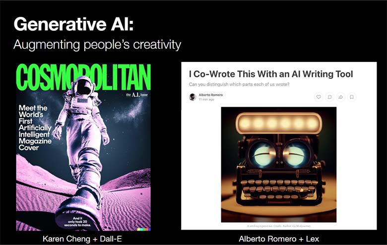 「ジェネレーティブAIによって自然言語で文法的な誤りのない優れたテキストを生成することができます。実際、イギリスの新聞ガーディアンには、ジェネレーティブAIによって書かれた記事が掲載されたことがあります。またある実験では、人が書いた段落と、ジェネレーティブ AIが書いた段落が混在する文章を読ませたところ、読者はどの部分が人によって書かれたものかを判断することができなかったという結果が出ました。それほど、AIによる文章が素晴らしいものになっているのです」(Maes氏)