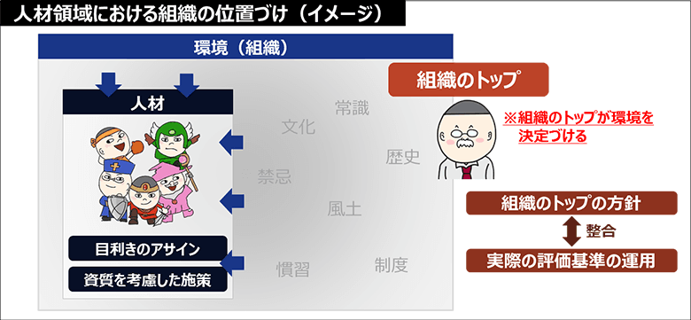 人材の問題って、最後は組織・文化などの環境の問題に行きつくんですよ。そして、環境を決定づけるのが、組織のトップです。そのトップからの方針やメッセージと実際の評価基準の運用の整合性が取れていないというのが隠れた課題です。」