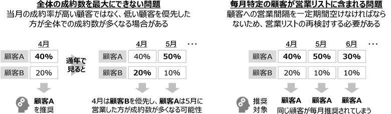 このようなケースの場合、AIモデル単体では問題を解決できません。例えば、AIによる成約率予測を活用することで、ある月のある営業手段における成約数を増大させることは可能です。しかし、図1のように通年で見ると、当月の成約率が高い顧客ではなく、低い顧客を優先した方が全体での成約数が多くなる場合があります。また、成約率予測のスコア順に営業リストを作成すると、毎月特定の顧客がリストに含まれてしまうため、再度リストを検討し直す問題もありました。これは、顧客満足度を低下させないように、営業間隔を一定期間空けるという会社の方針があるため発生する手戻りです。